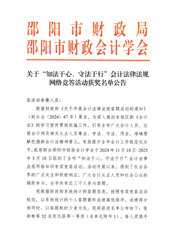 关于“知法于心、守法于行”会计法律法规网络竞答活动获奖名单公告
